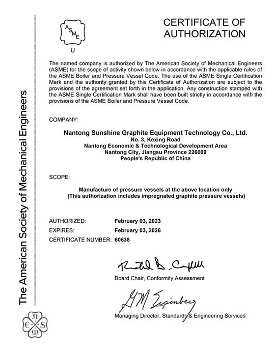 獲得ASME “U”鋼印認證標志著南通三圣在石墨設備制造方面的實力得到了國際權威的認可。這不僅體現(xiàn)了公司在研發(fā)、生產和質量控制方面的優(yōu)秀表現(xiàn),也是對公司持續(xù)創(chuàng)新和環(huán)保理念的有力證明。