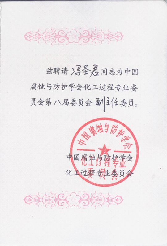 日前,公司馮圣君董事長收到證書,正式出任中國腐蝕與防護(hù)學(xué)會(huì)化工過程專業(yè)委員會(huì)第八屆委員會(huì)副主任委員。