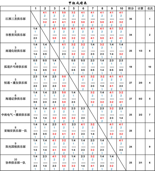 •       截止2013年12月15日,2013年南通市第五屆"城市嘉苑杯"乒乓球俱樂(lè)部聯(lián)賽完成了甲組、乙組、丙組的全部比賽,甲組成績(jī)公告如下: